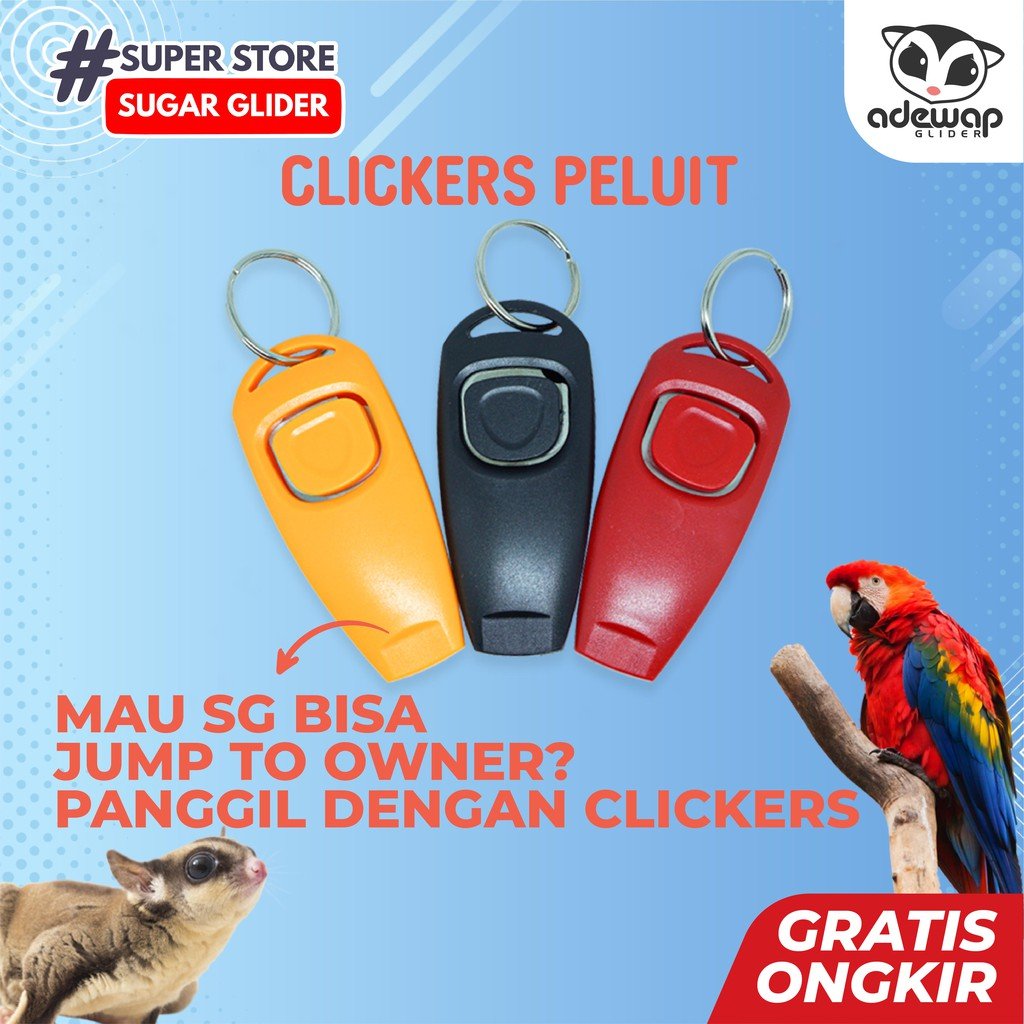 ready Peluit Clickers ini digunakan untuk melatih / training hewan seperti sugar glider untuk mengajarkan glide to owner / lompat ke pemilik, pastikan SG anda berada di tempat yang tinggi, kemudian klik clicker ini, maka sg anda akan melompat ke anda, tentunya dengan latihan, ngga instant, biasa digunakan untuk yang mau latihan untuk lomba lomba