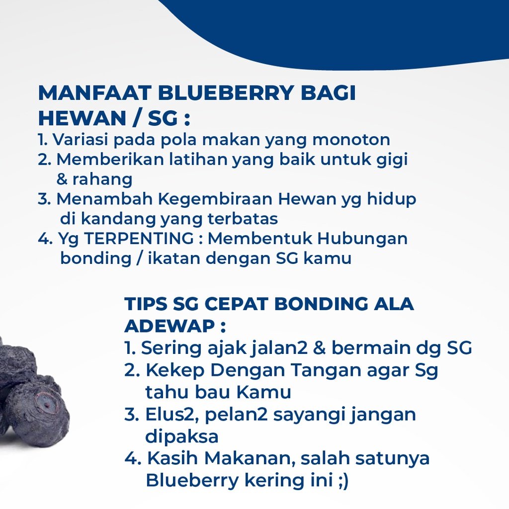 Dried Blueberry ini merupakan Camilan yang paling disukai oleh sugar glider dan hewan kecil lainnya.