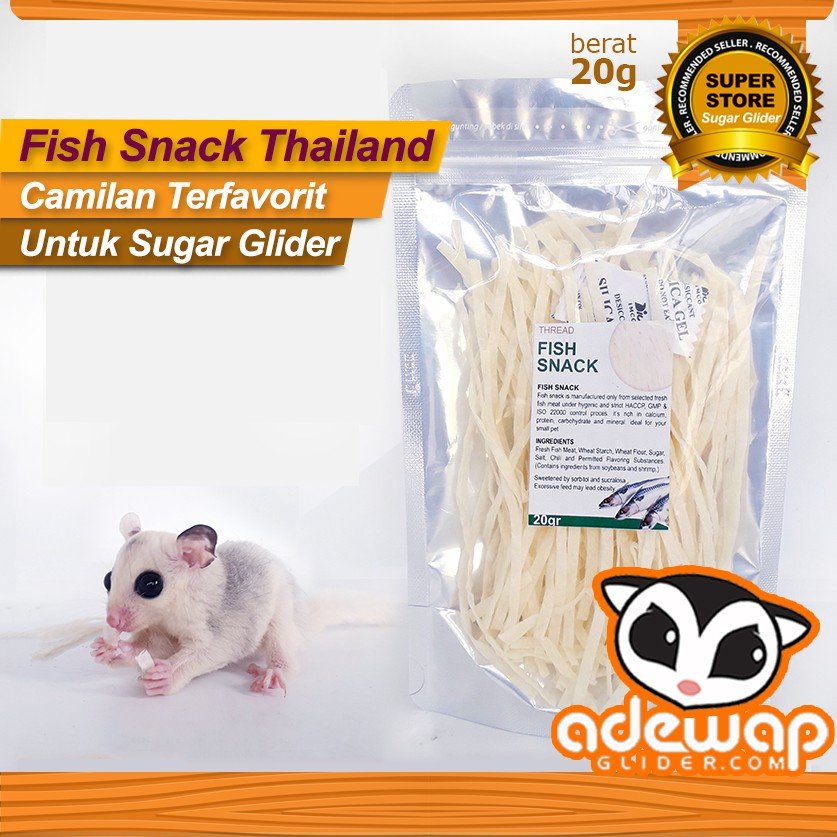 Fish Snack adalah camilan Favorite bagi Sugar Glider. Gunakan Fish Snack ini untuk bermain dengan sugar glidermu, juga sebagai alat untuk membantu proses bonding.