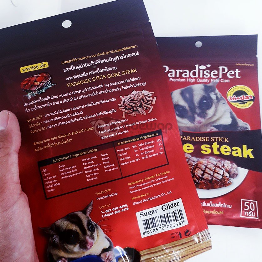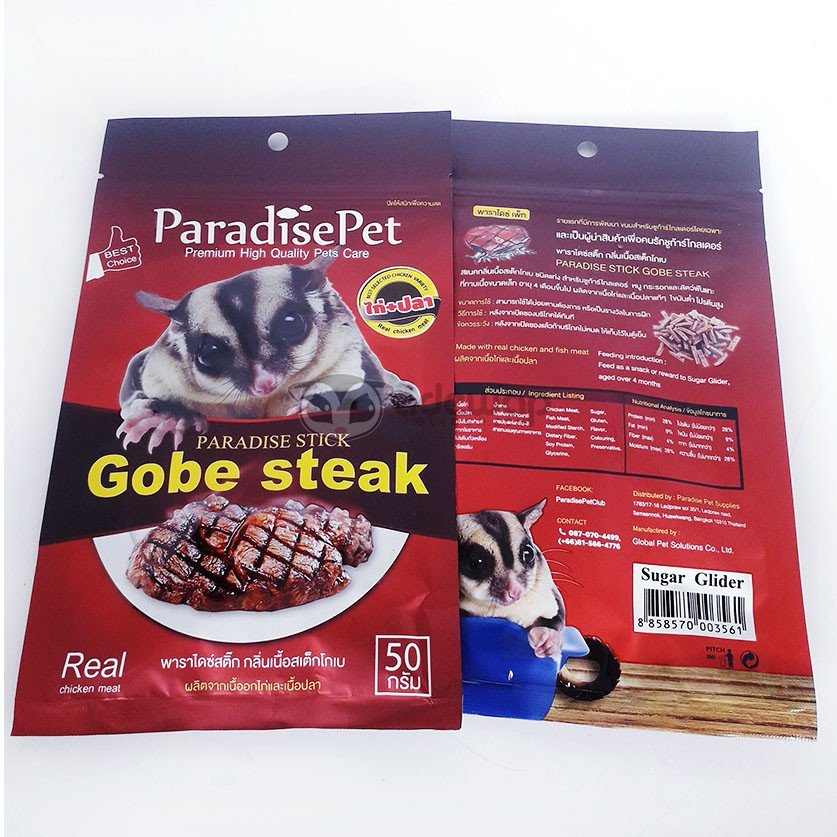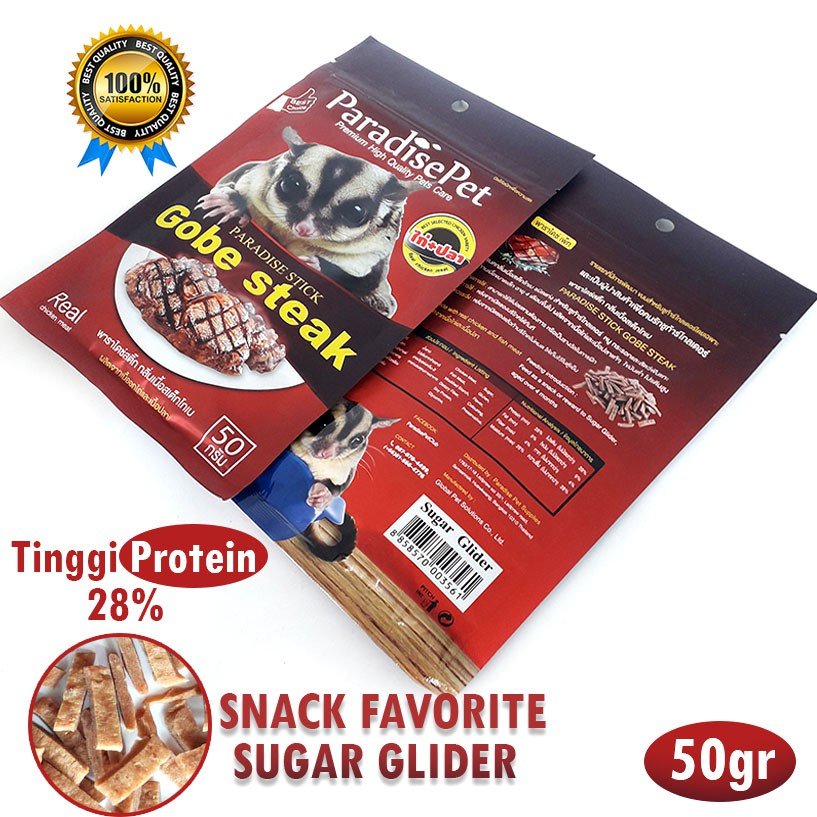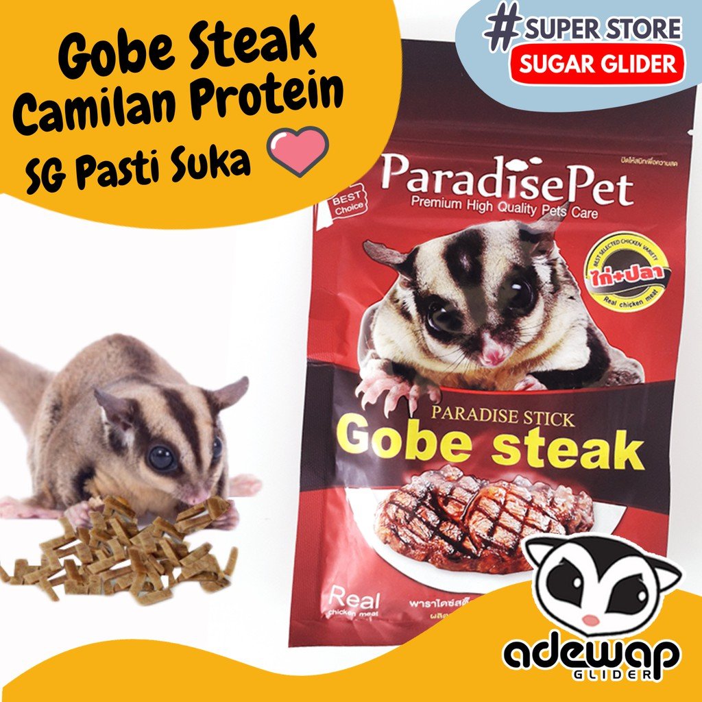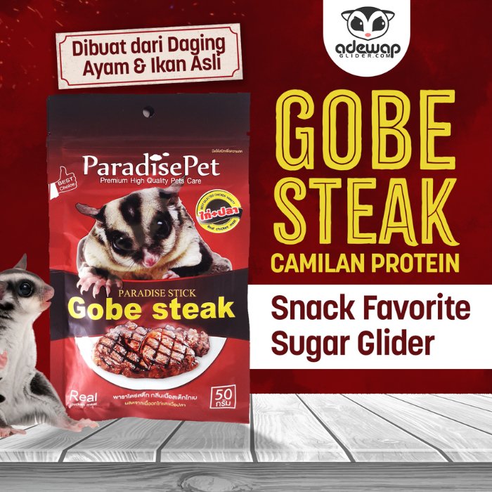 Gobe steak ini tinggi akan protein ( 28% ). Jumlah proteinnya malah melebihi yogurt. Camilan ini paling banyak dicari dan Digunakan oleh Sugar Glider Lovers