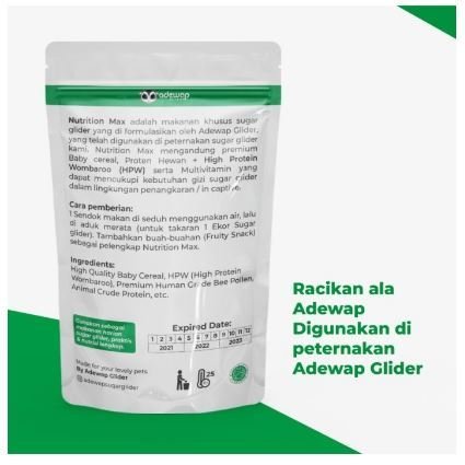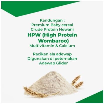 Adalah makanan siap saji khusus sugar glider dengan kandungan nutrisi lengkap Protein, Serat, Vitamin, Kalsium dan mineral penting yang bersumber dari :