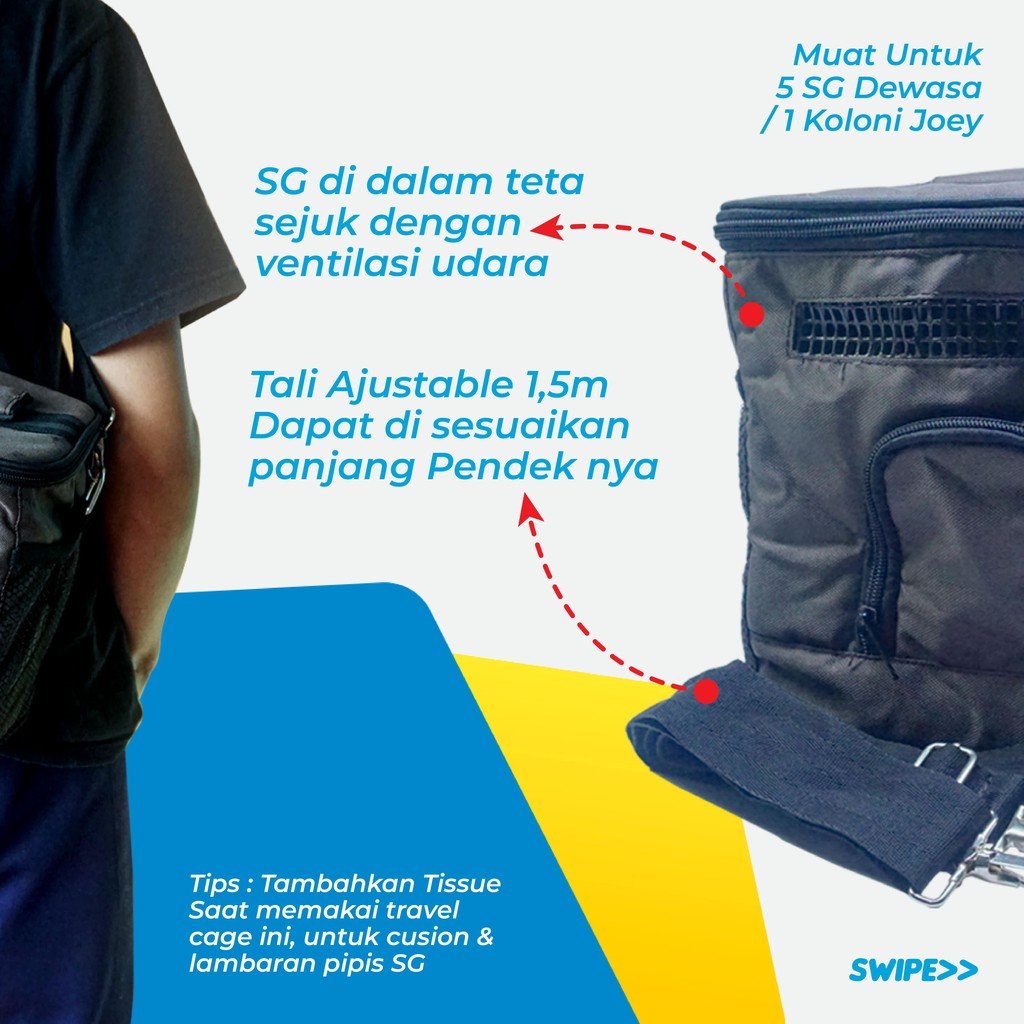 Mau pergi jalan jalan, sg jangan sampai ketinggalan, pake aja travel cage, bisa muat 3-4 Sugar glider, bahan luar water proof loh, dalam ada bulu, plus muat kandang juga, so pasti deh, sg bakalan betah traveling pake Travel cage ini… Yuk di order